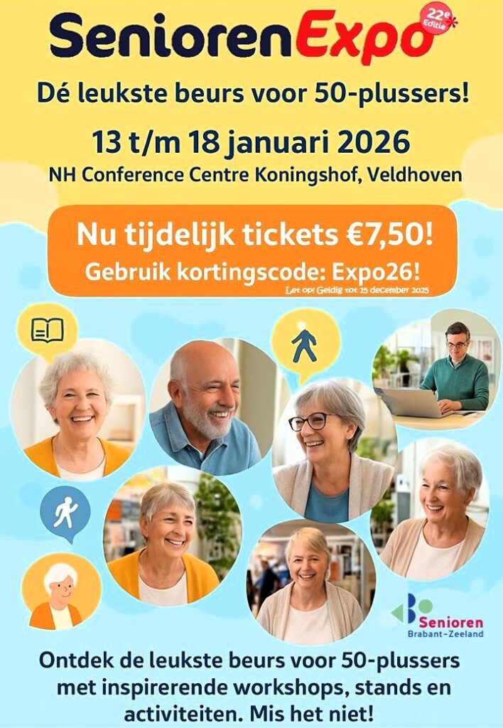 Vrijdag 5 december 20255 december is cadeautjesdag! Ons geschenkje voor u: toegangskaartjes voor de Senioren Expo die van 13 tot en met 18 januari in Veldhoven wordt gehouden voor de helft van de reguliere entreeprijs! Bestel ze nu, want de aanbieding geldt slechts tien dagen!