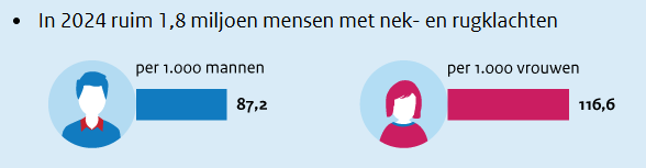 Nek- en rugklachten behoren tot de meest voorkomende lichamelijke klachten in Nederland. Volgens cijfers van VZinfo hebben bijna twee miljoen mensen te maken met nek- of rugpijn. Deze klachten komen voor bij zowel mannen als vrouwen en nemen toe met de leeftijd. Door vergrijzing en veranderingen in onze levensstijl – zoals meer zitten en minder bewegen – blijft de impact van deze klachten alleen maar groeien.