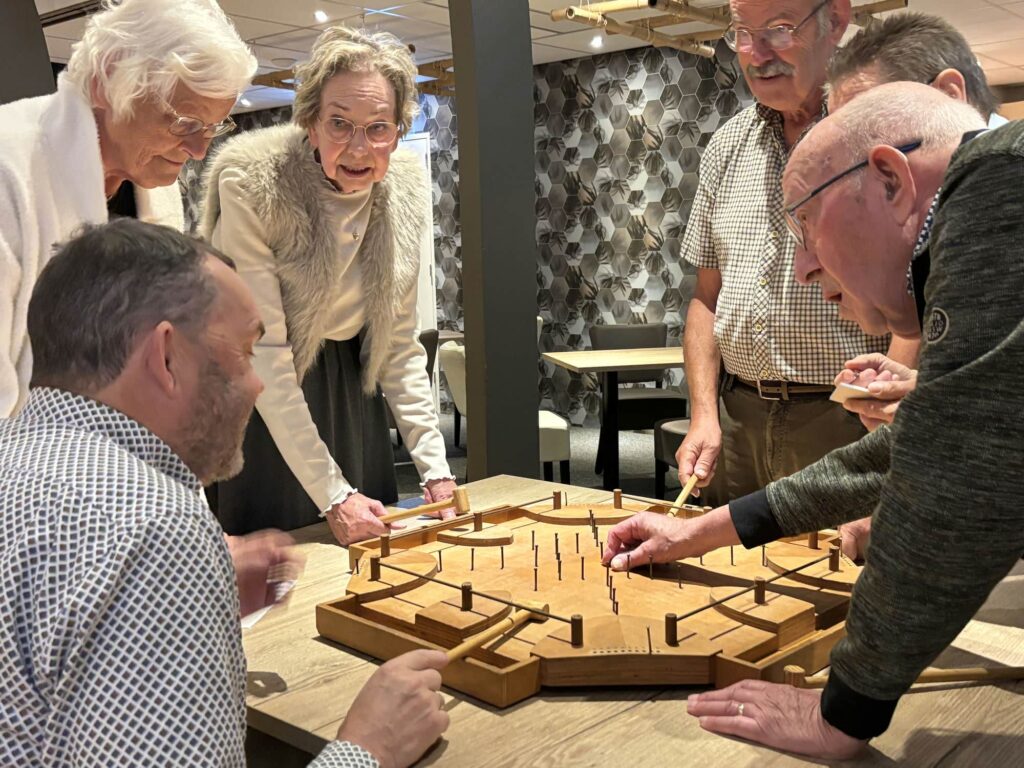 Het bestuur had goed nagedacht over de invulling van de middag. Het moest gaan over en met bewegen, behendigheid en alertheid. Wat is er dan mooier en ook simpeler dat in groepjes werken met diverse behendigheidsspellen. Deze stonden verspreid in de ruime zaal en gaandeweg ging elk groepje bij elk spel een toppoging wagen. Het was prachtig om mee te mogen maken. De opgewektheid, verbetenheid, het fanatisme, de geslepenheid, viel af te lezen van de gezichten van de spelers. Soms klonk het ‘ohhh’ van de teleurstelling, dan weer gejuich. Het mooiste waren de lachsalvo’s als het weer faliekant misging. Het was echt een feestje, een koperen feestje met een invulling die heel goed aansloot bij wat wij senioren zo nodig hebben. Plezier, humor, bewegen, alert blijven, ontmoeting en samen spelen.