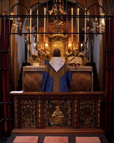In de kerk staan twee altaren achter elkaar. Bij het achterste, niet zichtbare, altaar bidt pater Hugo in afzondering dagelijks zijn getijdengebed. De H. Mis wordt bij het voorste altaar opgedragen.