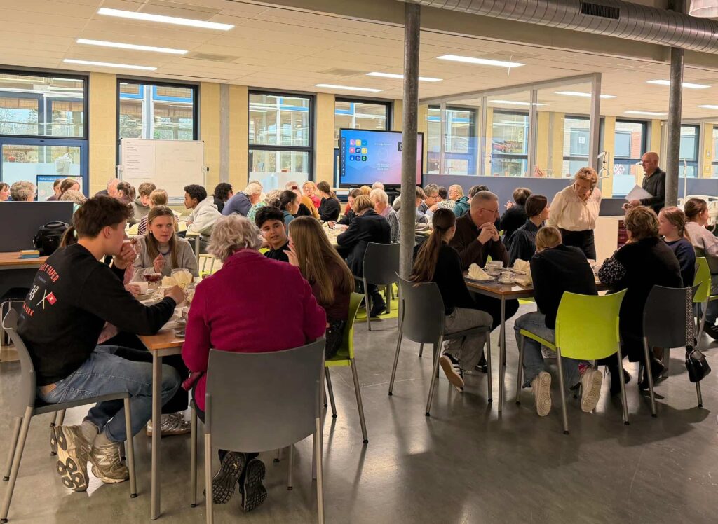 Pfff. Vmbo-leerling Ianis wrijft opgelucht over zijn gezicht. Hij is klaar met zijn praatje voor het hooggeëerd publiek van zo’n veertig senioren en mantelzorgers over wat de high tea vanmiddag op het Dendron-college gaat brengen. Vol verwachting schuiven de gasten aan, terwijl de leerlingen de soepjes naar de keurig gedekte tafels brengen en zelf ook plaatsnemen.